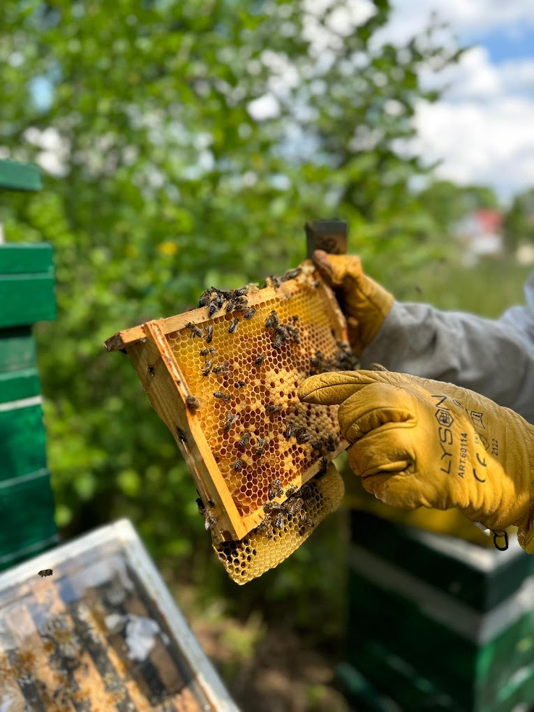 Sobald die Honigwaben prall gefüllt und von den Bienen verschlossen sind, entnehmen wir sie vorsichtig aus den Beuten. Dabei wird jede Wabe mit einer speziellen Entdeckelungsgabel geöffnet – wir verzichten bewusst auf Heißluftmethoden, um die wertvollen Inhaltsstoffe des Honigs zu schonen.